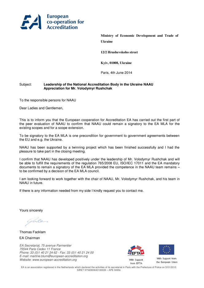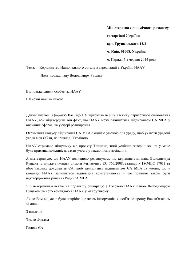 Лист-подяка Володимиру Рущаку від Голови ЄА Томаса Факлама