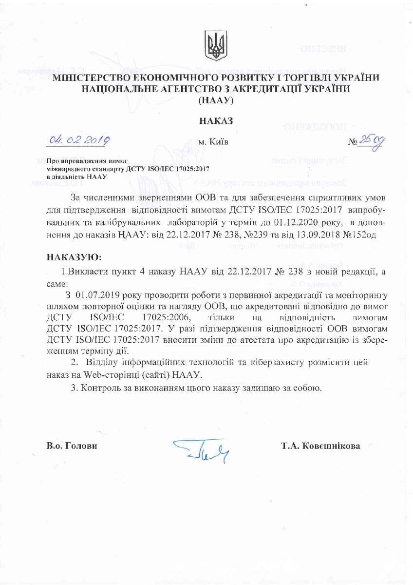 Наказ № 25 од від 04.02.2019 " Про впровадження вимог міжнародного стандарту ДСТУ ISO/IEC 17025:2017 в діяльність НААУ "