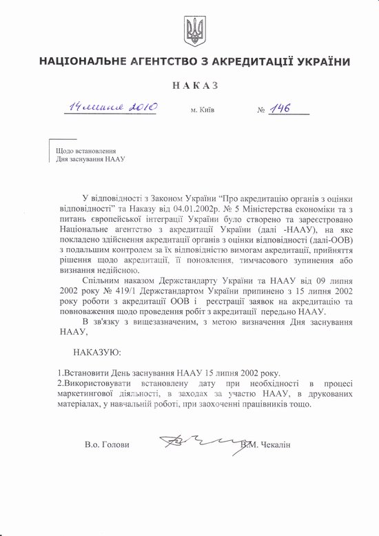 Наказ НААУ від 14.07.2010 № 146 "Щодо встановлення Дня заснування НААУ"
