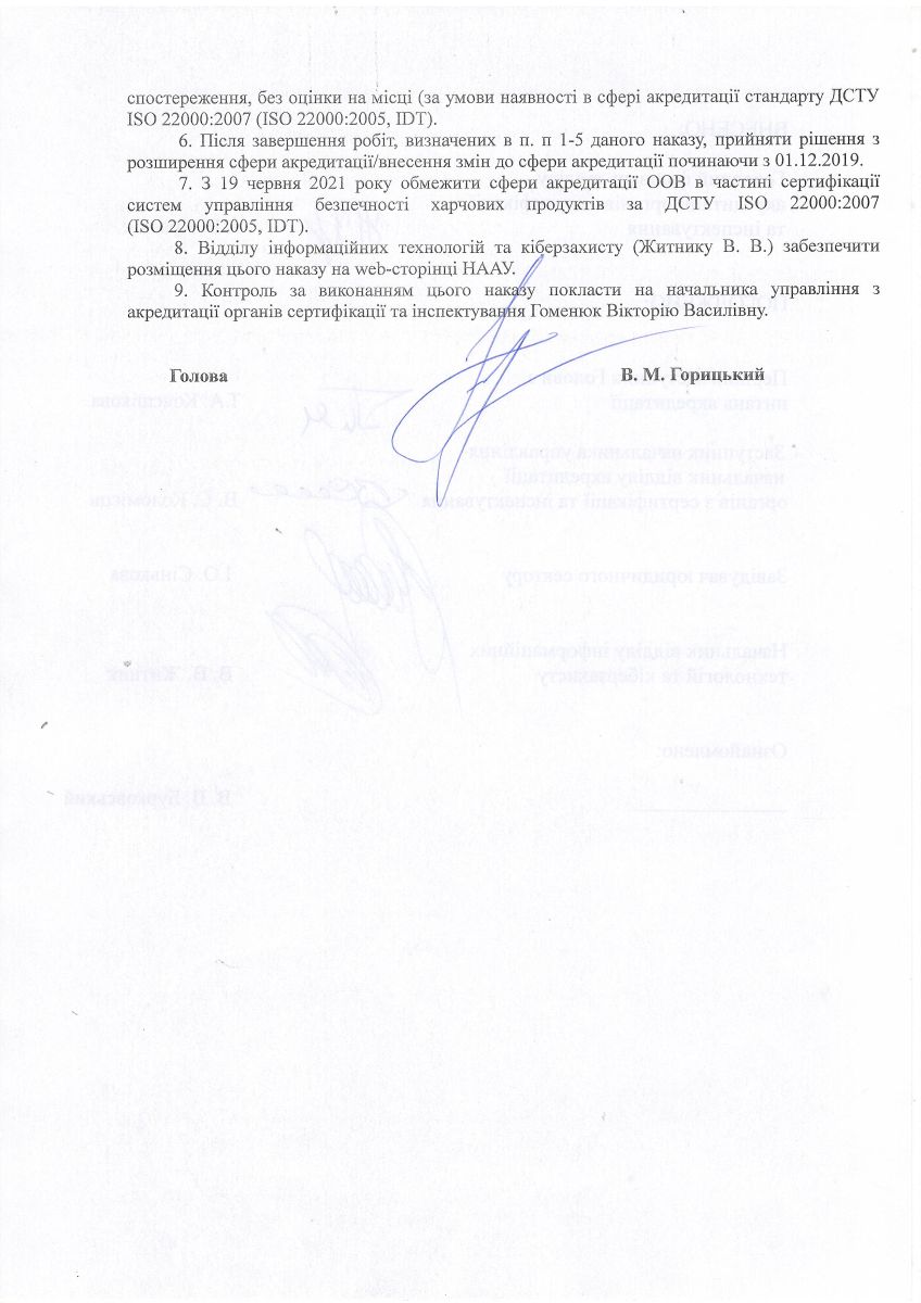 Наказ про впровадження національного стандарту ДСТУ ISO22000:2019